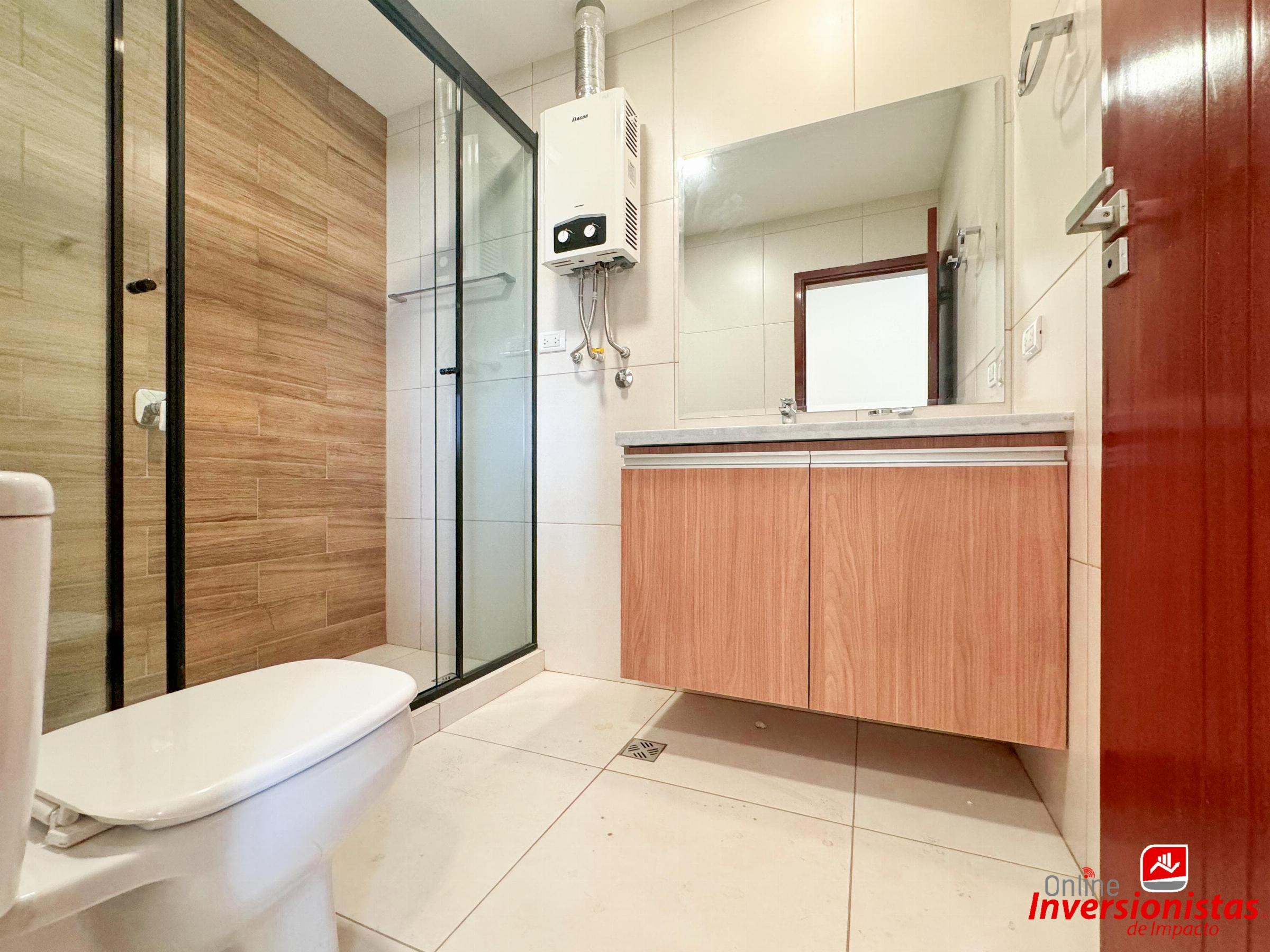 ♦️Baño amoblado con cajoneria baja, espejo, box de baño y accesorios